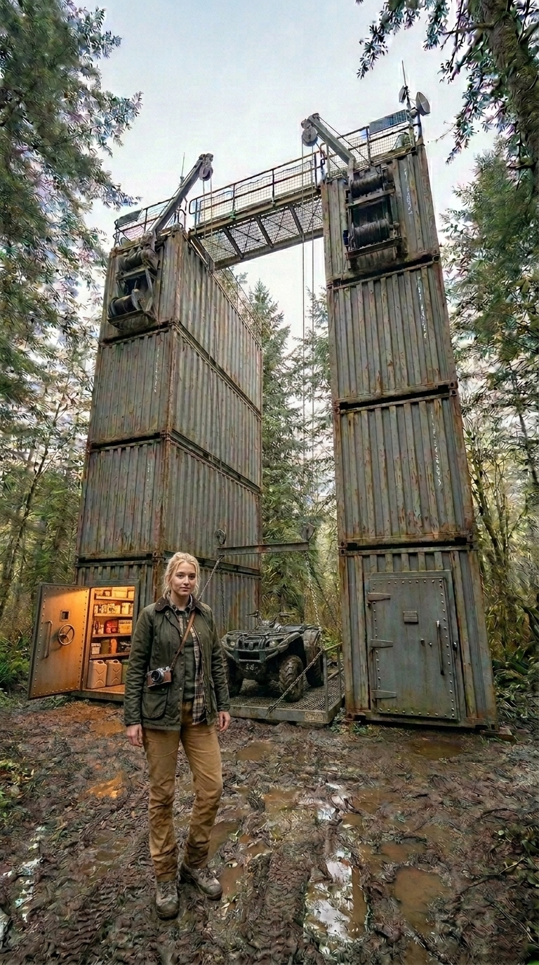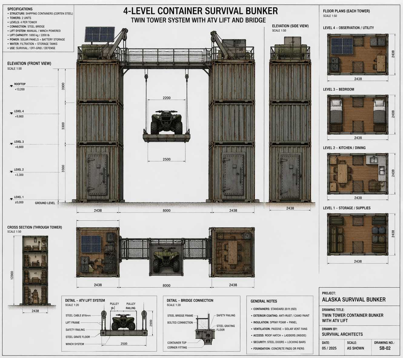 Designed for extreme resilience and long-term ???????ous living, this 4-level container bunker system combines industrial durability with modern survival engineering. Built from reinforced shipping containers and configured as twin vertical towers connected by a steel bridge, this structure provides a secure, elevated living environment optimized for remote locations such as Alaska or other harsh wilderness zones.