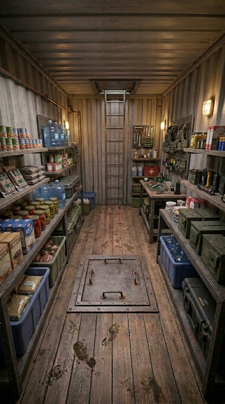 At the center of the layout is a heavy-duty square floor hatch, providing secure access to lower levels. A vertical ladder connects all floors, allowing fast movement between zones while maintaining a compact footprint. The walls are lined with industrial shelving systems, storing essential supplies such as food reserves, water containers, medical kits, and daily-use equipment. Everything is arranged for quick access, reducing response time in critical situations.