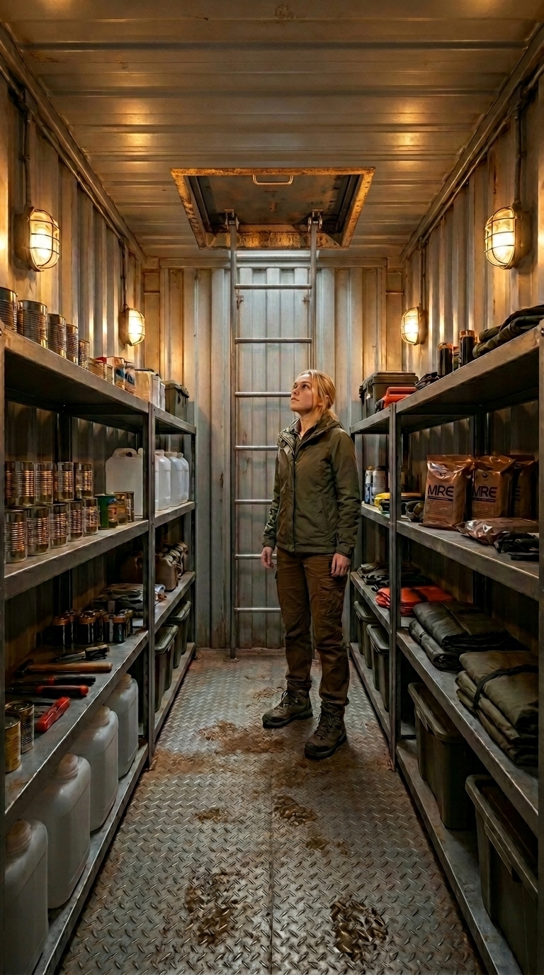 The first section is dedicated to food and essential supplies. Industrial shelves are filled with canned goods, dry rations, water containers, and long-term storage items. Everything is organized for durability and easy access, allowing quick inventory checks and efficient daily use. Large water reserves ensure ???????????? for extended periods without external sources.