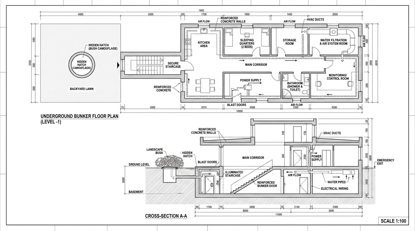 Specialized features such as hydroponic farming zones, medical rooms, storage vaults, and mechanical systems like vehicle lifts or hidden entry mechanisms further increase complexity. These additions can range from $100,000 to $300,000+, depending on scale and technology level.