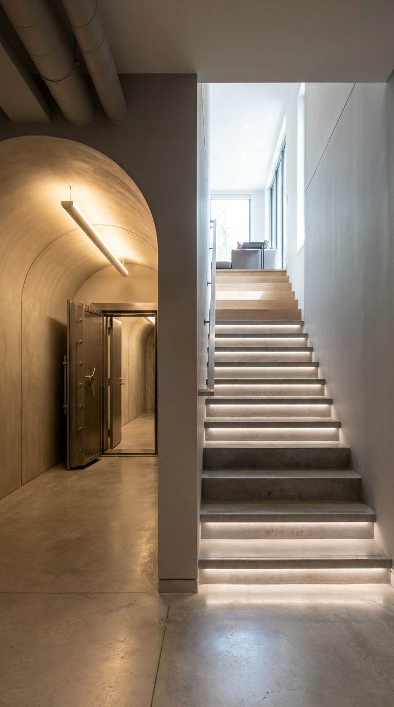 The staircase is designed with integrated LED lighting, providing clear visibility at all times, including during power outages or emergency conditions. Each step is evenly illuminated, reducing the risk of slipping or disorientation when moving quickly between levels. The clean architectural lines and minimalistic design make the transition feel like a natural extension of the house rather than a hidden technical passage.