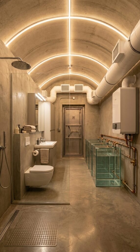 A wall-mounted toilet and minimalist sink unit optimize space while maintaining a clean, modern aesthetic. Every surface is made from moisture-resistant materials, allowing the area to withstand constant humidity without degradation. Soft integrated lighting follows the curved ceiling, creating a warm and relaxing atmosphere that contrasts with the technical nature of the bunker.