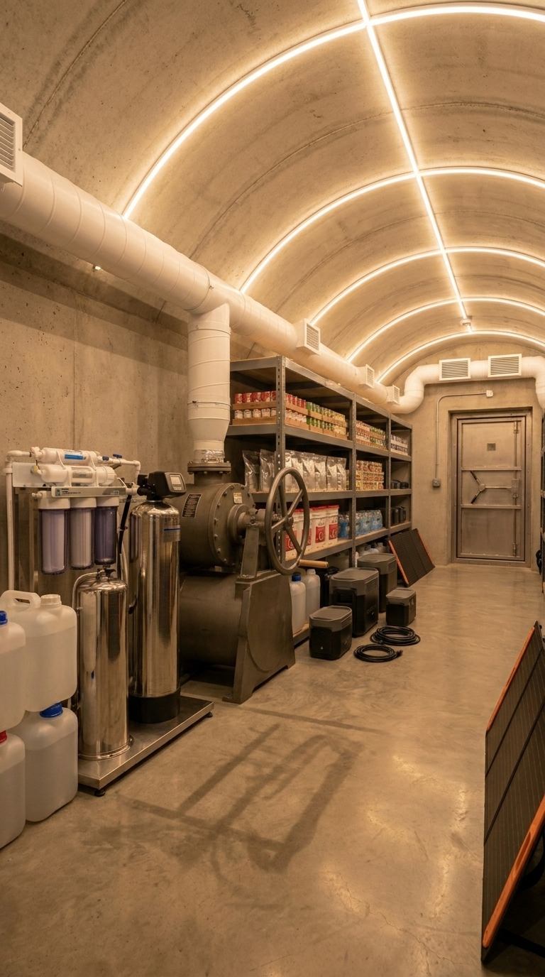 Engineering systems form the core of a premium bunker. This includes military-grade air filtration (NBC systems), advanced ventilation, water purification and storage, smart electrical infrastructure, and redundant power sources such as high-capacity battery systems, solar integration, and backup generators. These systems are designed for long-term autonomy and reliability, adding approximately $150,000 to $400,000+ to the total cost.
