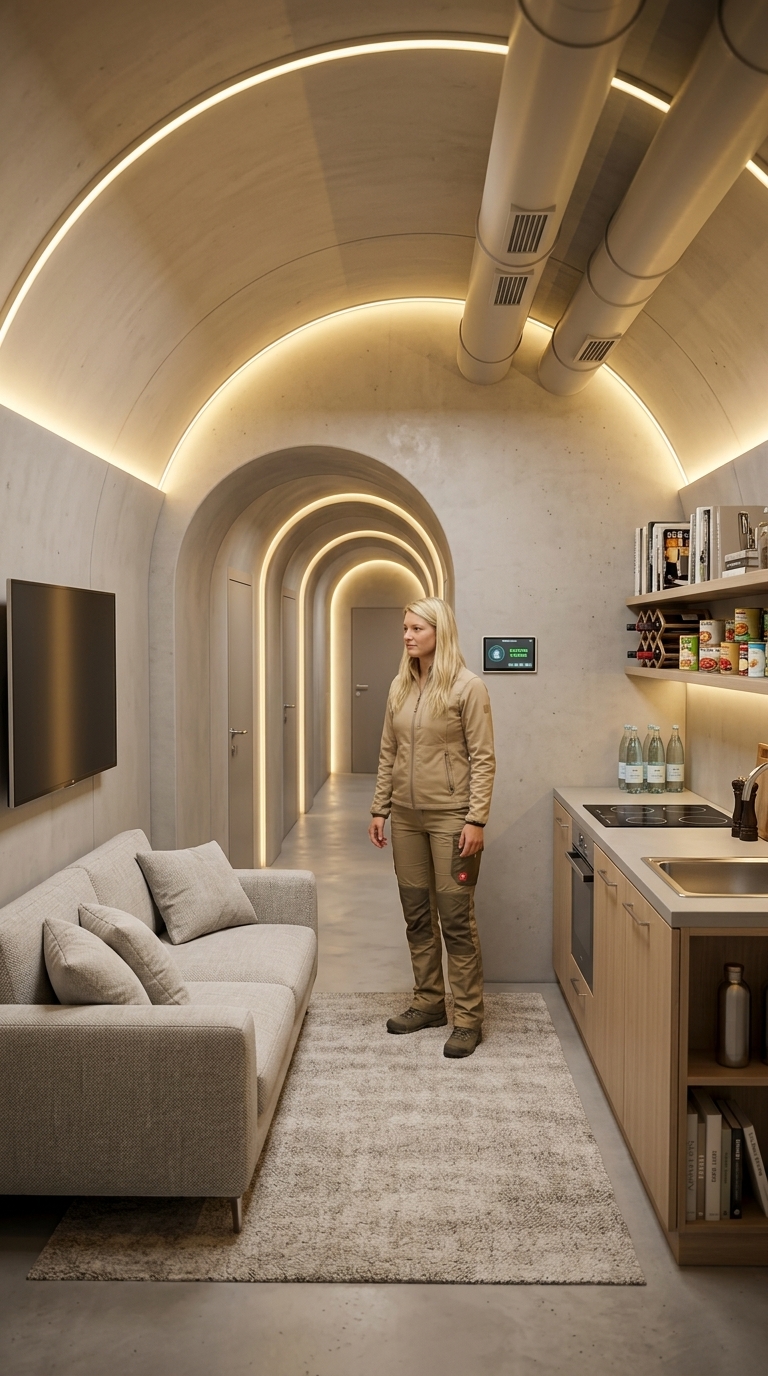 This underground corridor redefines what a modern bunker interior can be, combining architectural elegance with full everyday functionality. Designed with a smooth arched concrete structure, the space creates a clean, minimalist environment that feels more like a high-end apartment than a survival shelter. Soft integrated LED lighting follows the curves of the ceiling, providing warm, even illumination that eliminates the feeling of being underground.