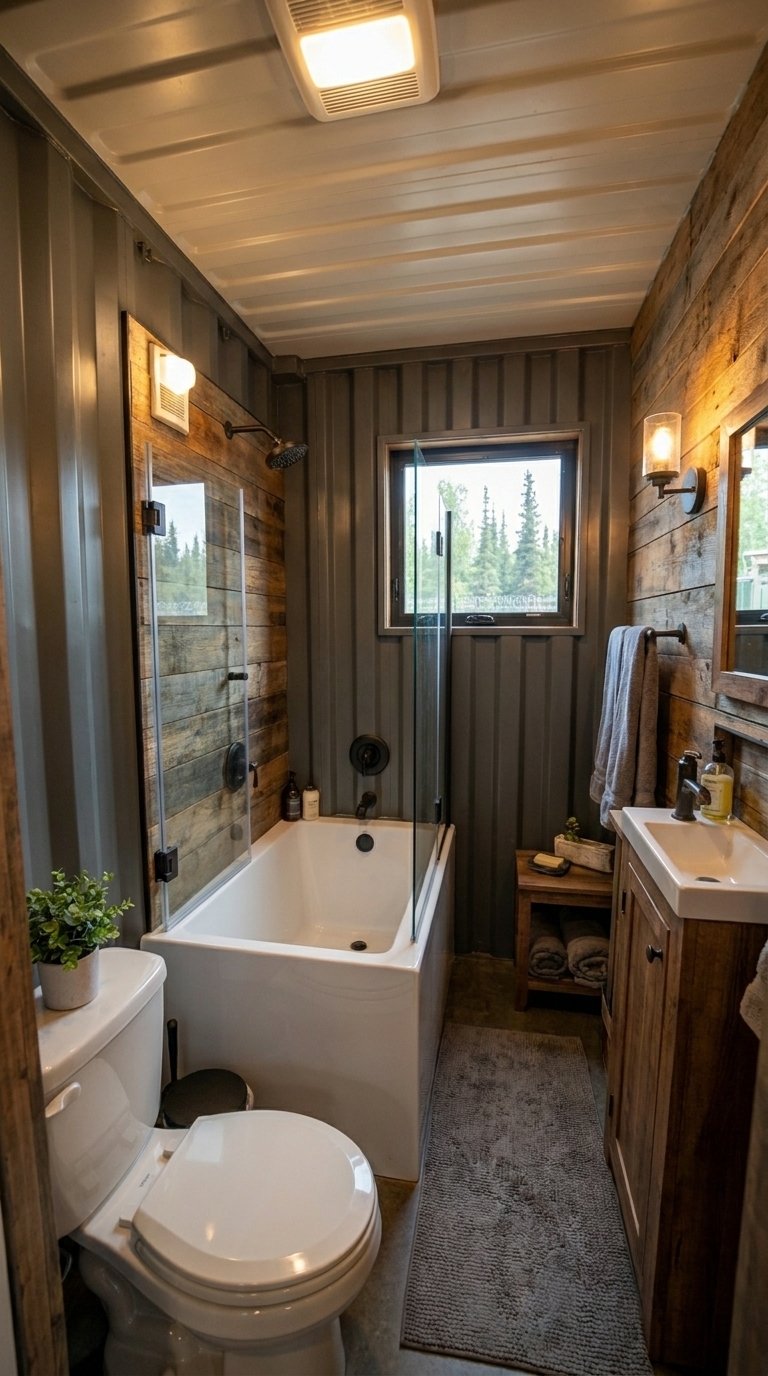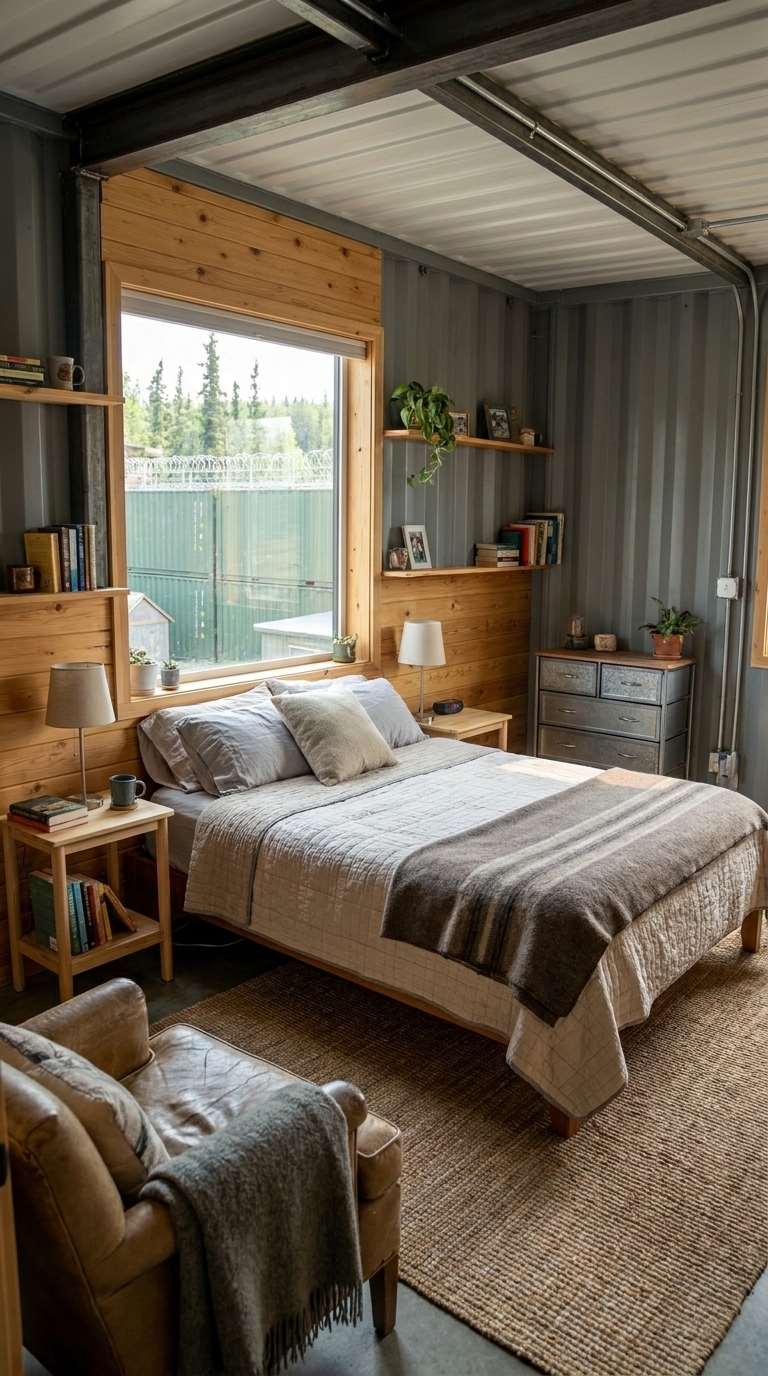 The bedroom area provides privacy and comfort, featuring a well-insulated environment with soft furnishings and natural light. It is designed not just for rest, but for recovery — an essential factor in any long-term off-grid scenario. The use of wood elements adds warmth, balancing the industrial nature of the container walls.