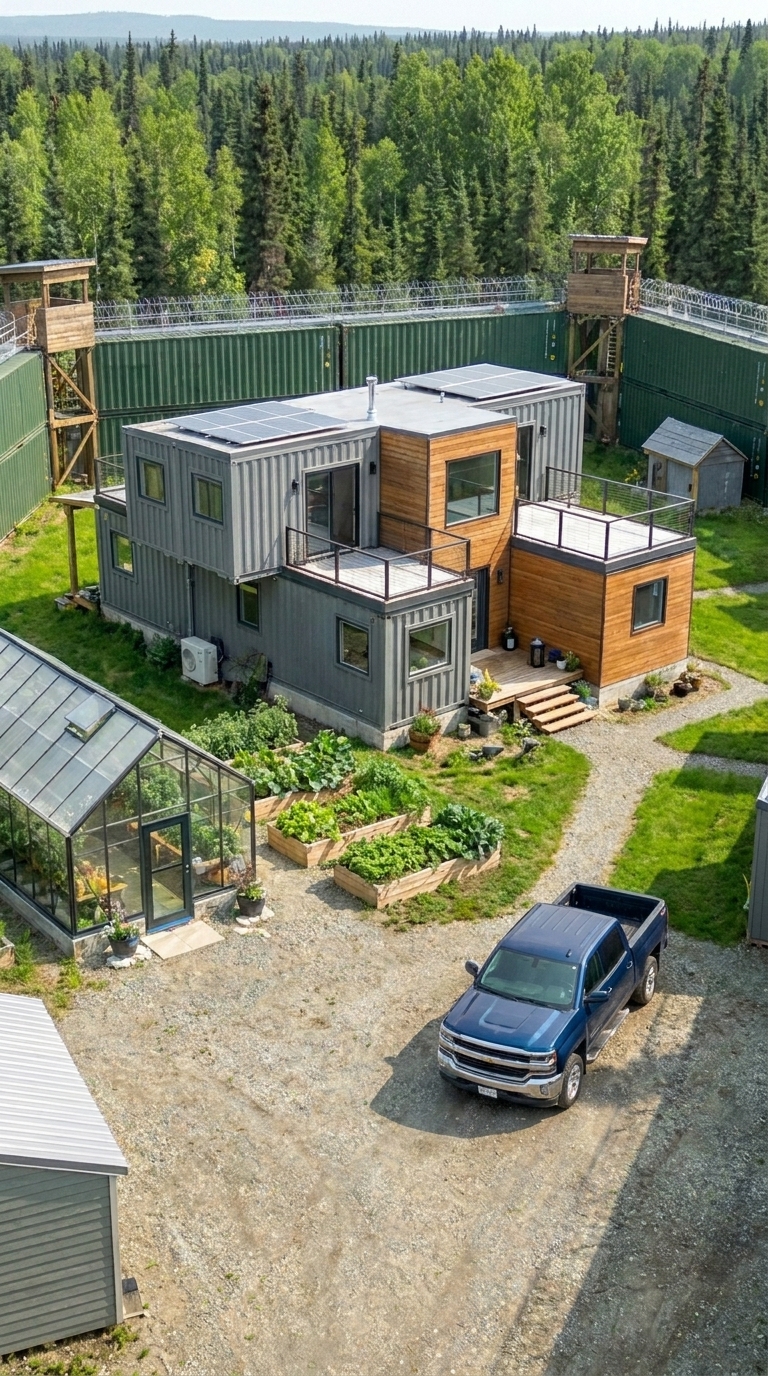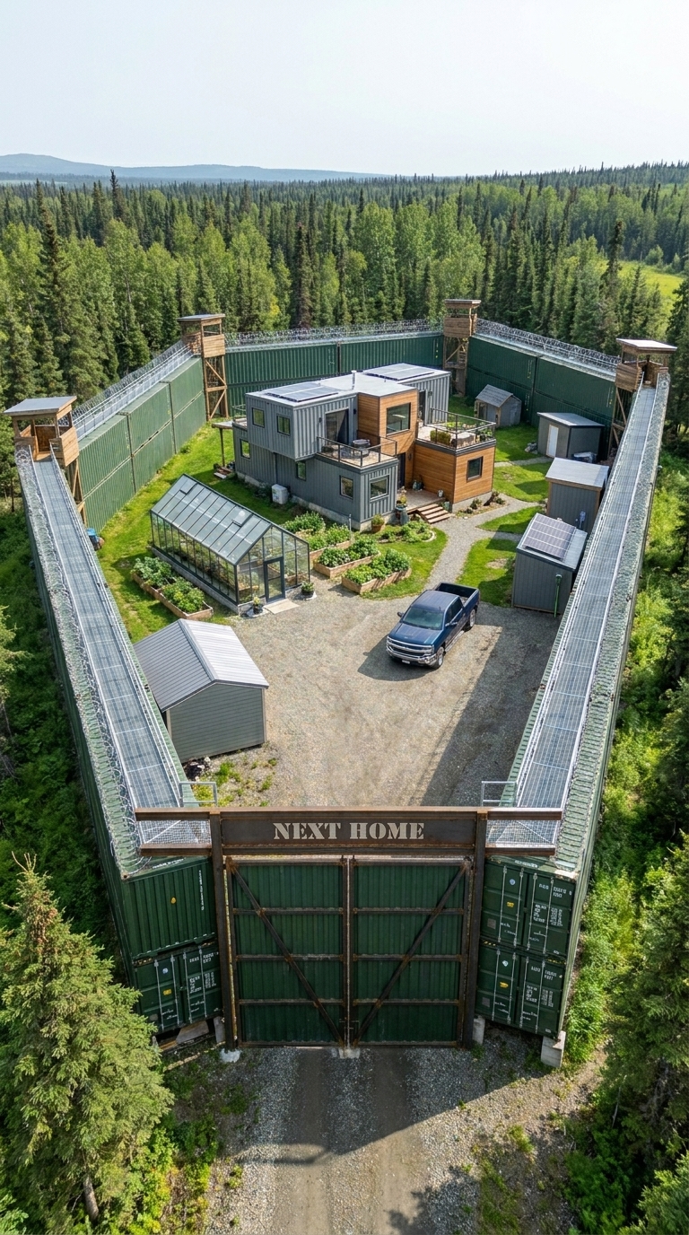 A fortified perimeter made from shipping containers, reinforced entry gates, surveillance cameras, motion sensors, and watchtowers. This creates a controlled and protected environment around the property.