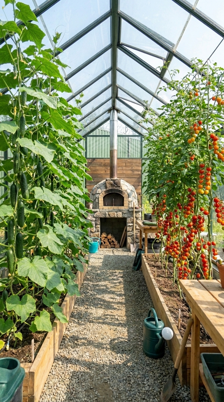 Inside the greenhouse, the system becomes even more advanced. Protected by transparent panels, crops such as tomatoes and cucumbers grow in a stable microclimate, shielded from cold temperatures and harsh winds. A built-in wood-fired stove provides additional heat during colder periods, extending the growing season far beyond natural limits. This ensures that fresh vegetables are available even when the outside environment becomes hostile.