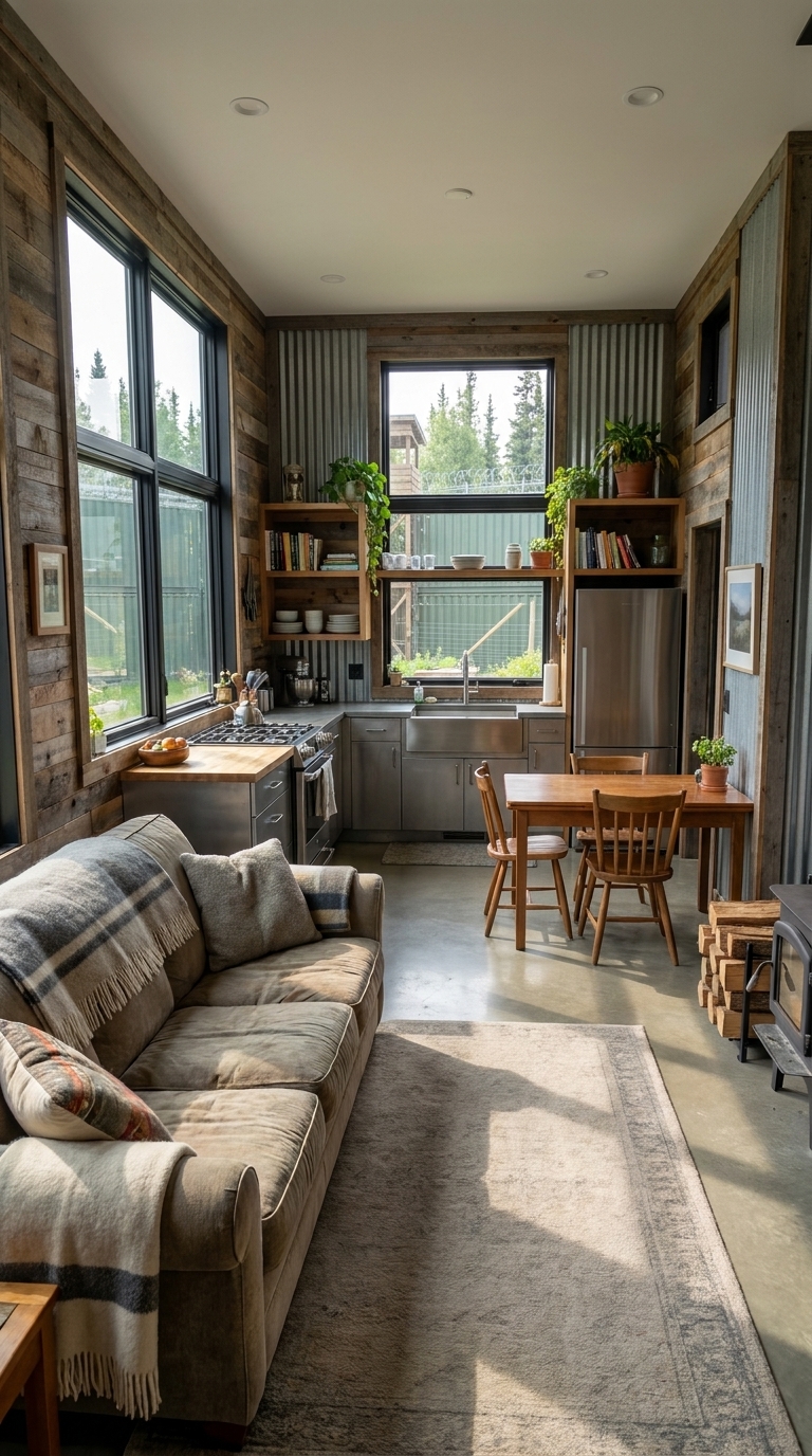 From the outside, the house presents a minimalist yet solid appearance, blending industrial steel with warm wooden accents. Elevated slightly above ground level, it offers protection from moisture and improves insulation efficiency. Large windows bring in natural light, creating a bright and open atmosphere that contrasts with the surrounding wilderness. Solar panels installed on the roof provide a stable and renewable energy source, reducing dependence on external infrastructure.