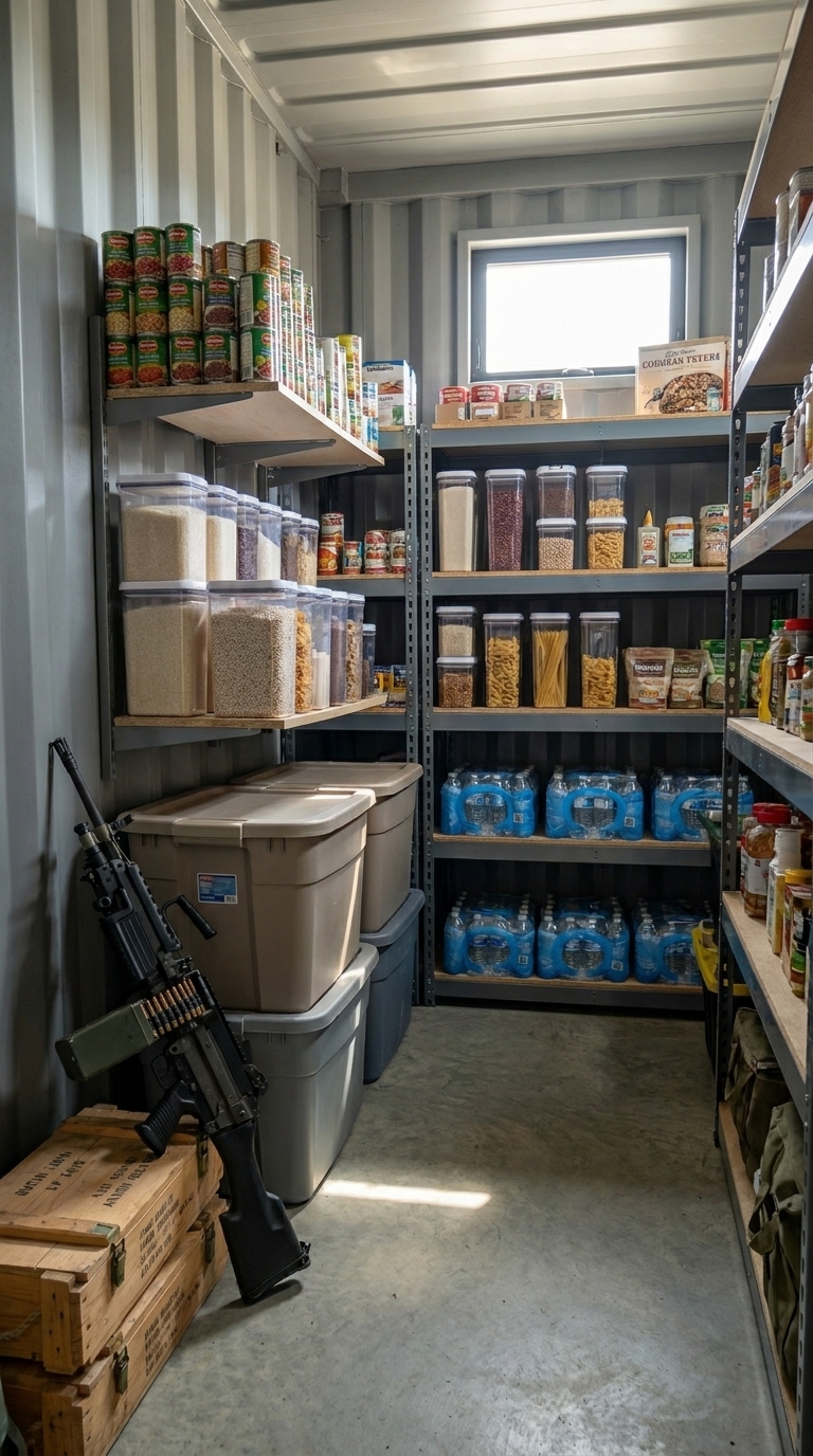 Inside, industrial shelving systems hold a wide range of long-term supplies. Rows of canned goods, dry foods like rice, pasta, and grains, as well as sealed containers with bulk ingredients ensure that there is always a reliable food reserve. Everything is categorized and labeled for quick access, allowing instant inventory checks without unnecessary searching. This level of organization is critical in situations where time and clarity matter.