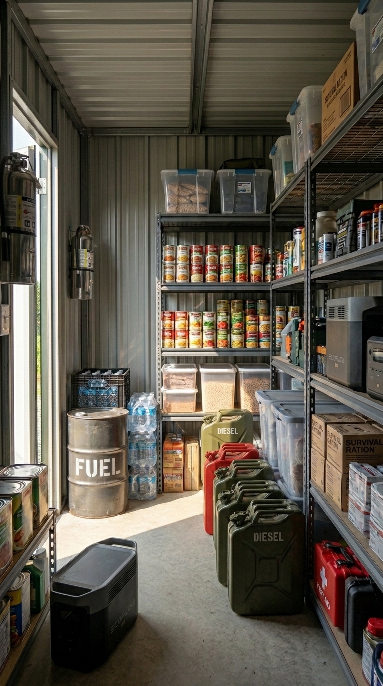 Fuel storage is separated and secured, with clearly marked diesel canisters and reinforced containers. This fuel supports generators, vehicles, and critical equipment, ensuring that the entire base remains operational even during extended isolation. Safety is a priority — proper spacing, ventilation, and containment reduce any associated risks.
