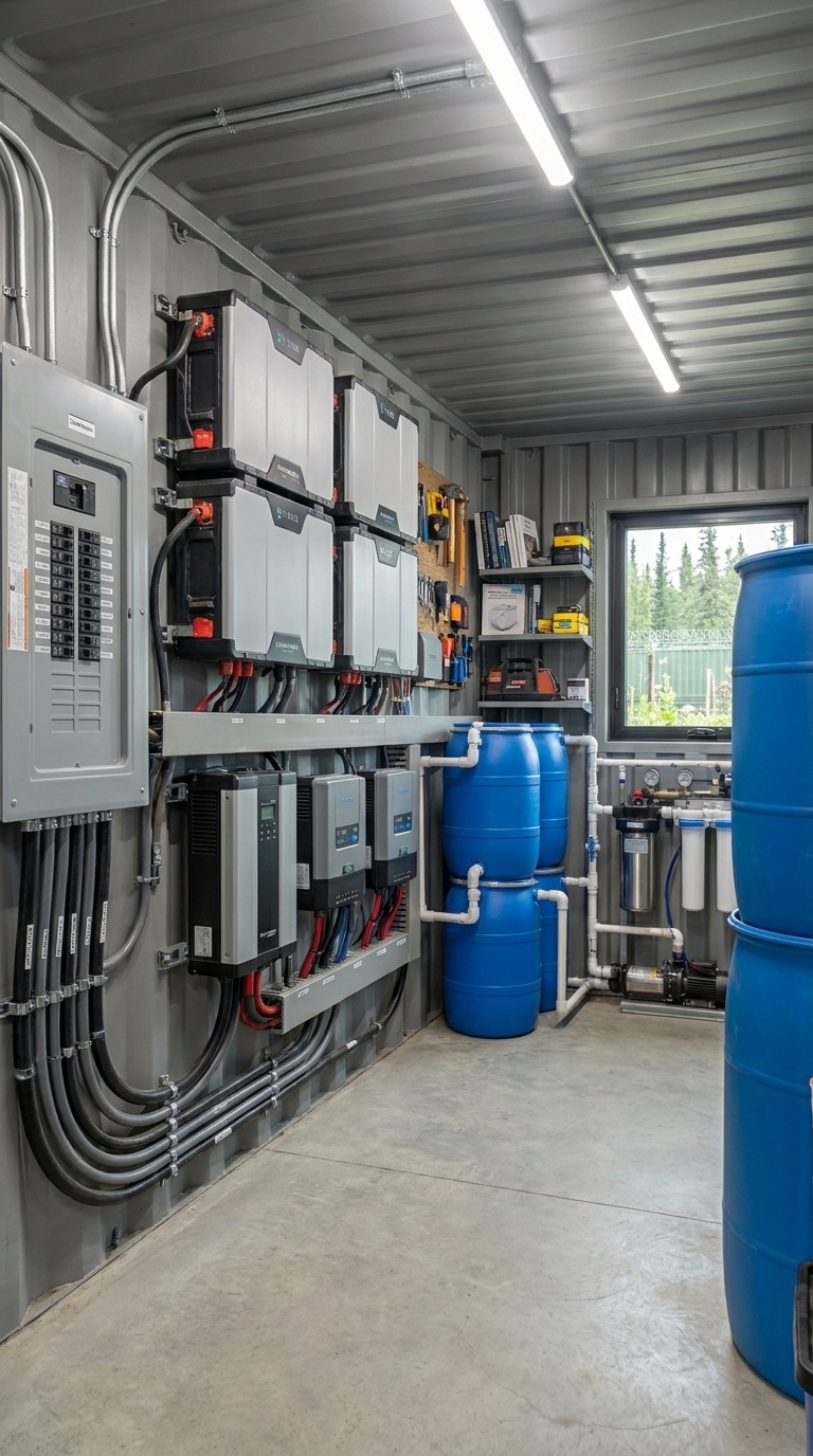 Solar panels, battery storage, inverters, backup generators, and full electrical wiring ensure stable power. Water systems include filtration units, storage tanks, pumps, and purification systems, allowing safe long-term use without external supply.