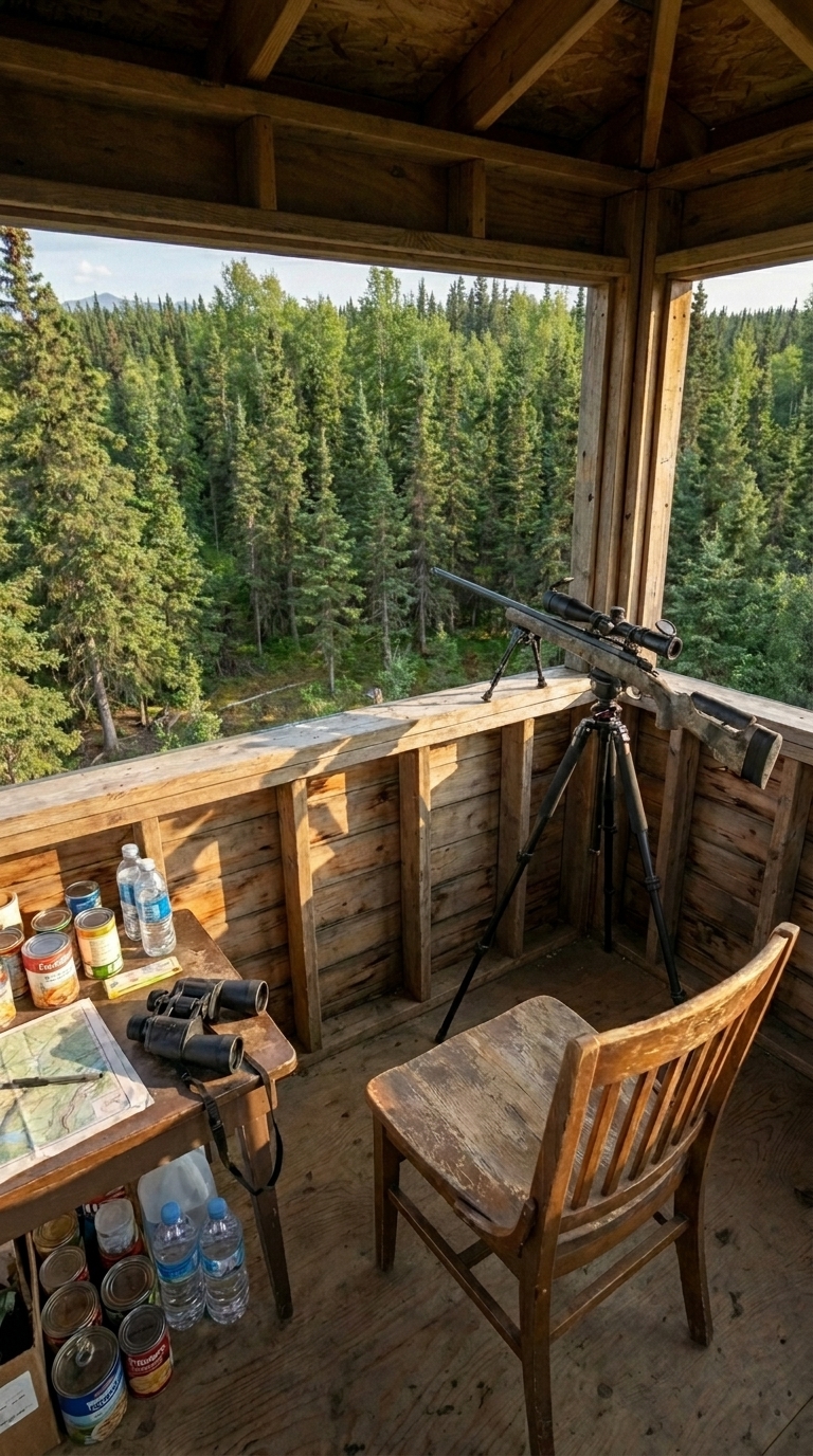 Inside every tower, the space is designed for long observation shifts. A stable platform supports precision optics, including binoculars and long-range scopes mounted on tripods for steady surveillance. A small workstation with maps and essential supplies allows for planning, tracking, and communication. ????? ???? ? ??? ensures that each position can remain operational without constant resupply.