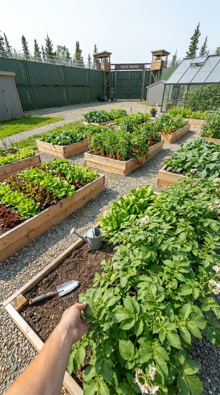Inside the perimeter, we built a self-sustaining ecosystem. A greenhouse with a heating system allows us to grow vegetables all year round, even in harsh climates. Around it, we created outdoor garden beds for seasonal crops. Storage units are filled with long-term supplies, tools, and fuel reserves — everything needed to stay off-grid for extended periods.
