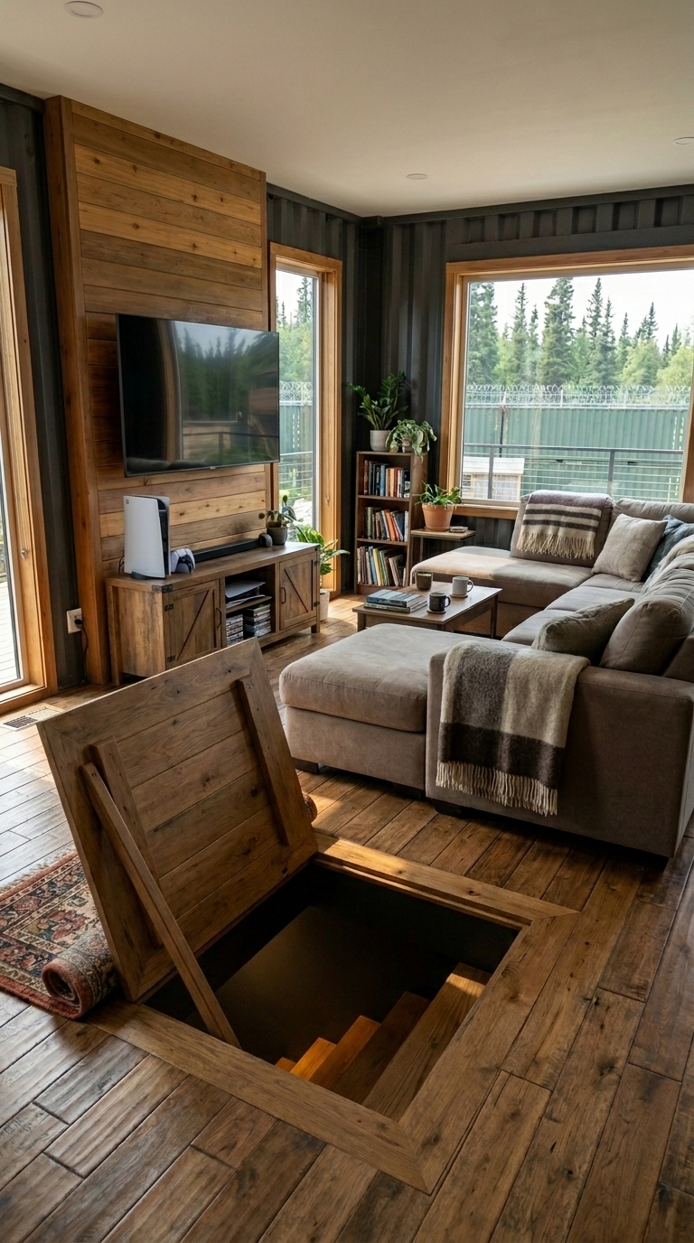 What makes this container home truly unique is the hidden layer beneath it. Integrated into the structure is access to an underground bunker, providing an additional level of safety in extreme situations. This dual-layer concept — comfortable living above, reinforced protection below — creates a complete survival solution without compromising everyday life.