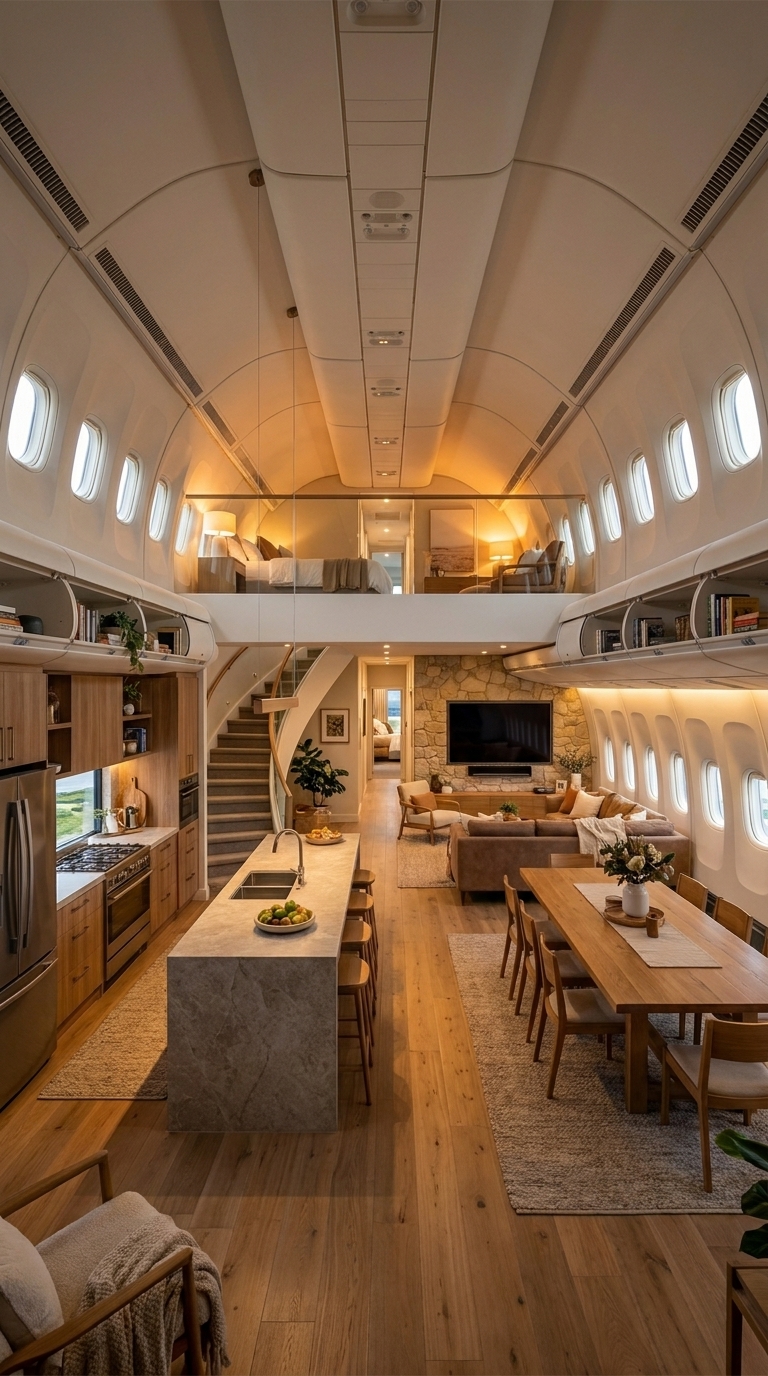 Inside, the project reaches a completely different level. What used to be a standard aircraft cabin is now a fully functional and beautifully designed living space. The interior combines natural materials like wood and stone with the original aircraft structure, creating a unique balance between warmth and engineering precision.