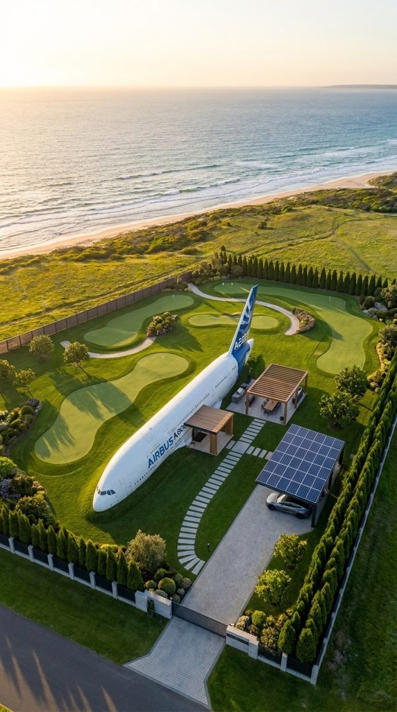 Around the aircraft, we created a fully functional and beautiful property. The land was shaped to blend with the coastal environment, and we added unique lifestyle elements that make everyday living enjoyable. A small private golf area became a place to relax, while a solar-powered carport supports our move toward energy independence. We now drive an electric Volvo and use a compact golf cart to move around the property.