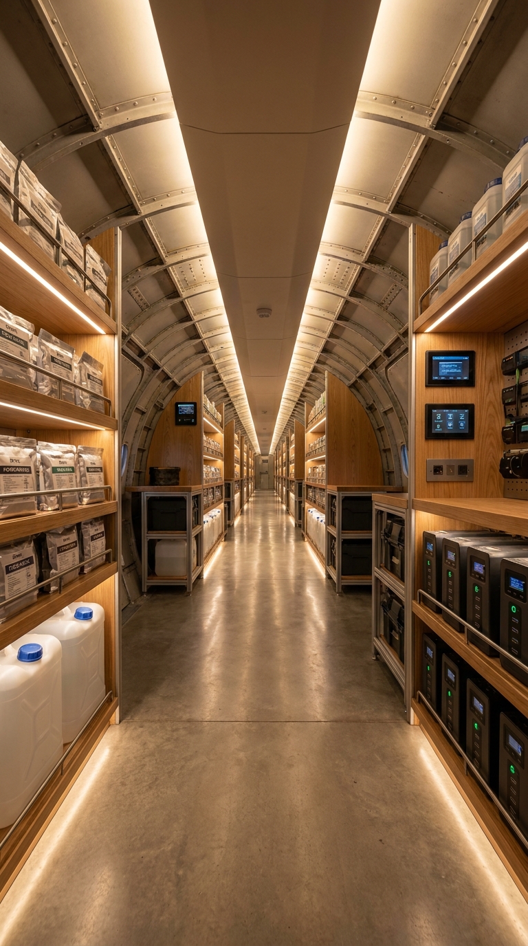 Below, the bunker level is built for reliability and long-term use. This area includes a fully organized supply corridor with food storage, water reserves, and technical systems. Everything is structured for efficiency, with clear zoning and easy access to critical resources. The lighting and layout are designed to reduce stress and make the underground environment comfortable for extended stays.