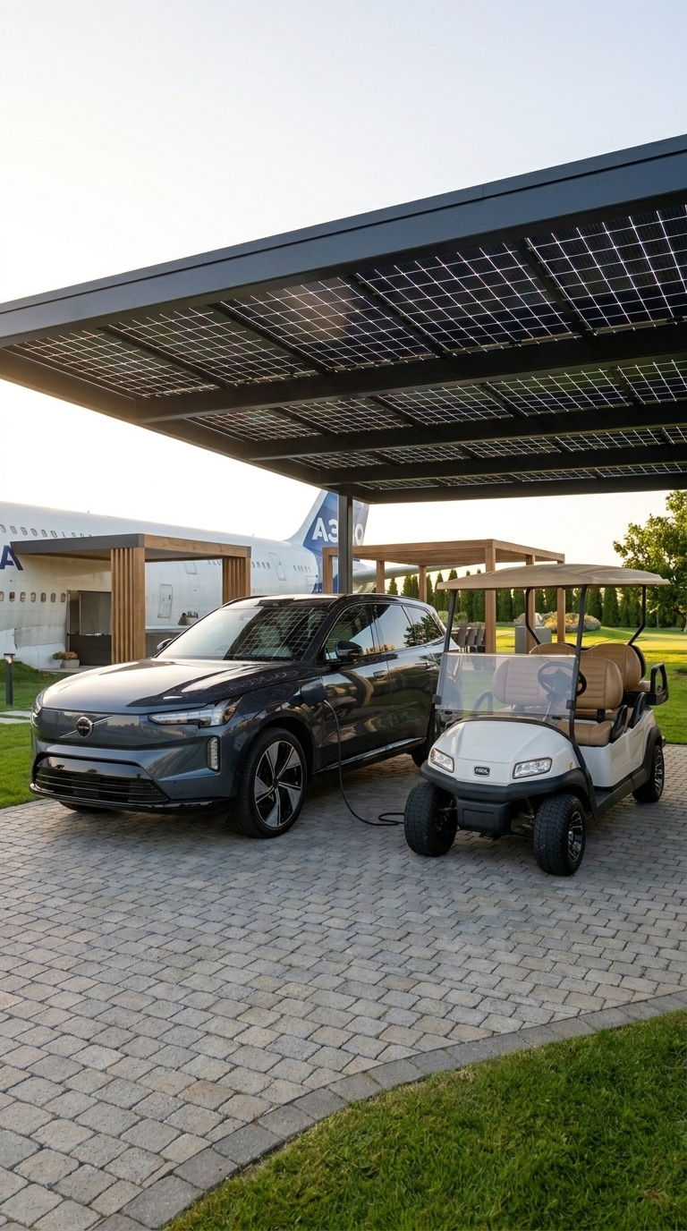 One of the key additions is the solar-powered carport. Under it, we placed our electric Volvo, creating a fully autonomous charging solution directly at home. The system allows us to generate clean energy during the day and use it for daily driving without relying on external infrastructure. Next to it, we added a compact golf cart, which quickly became the most convenient way to move around the property.