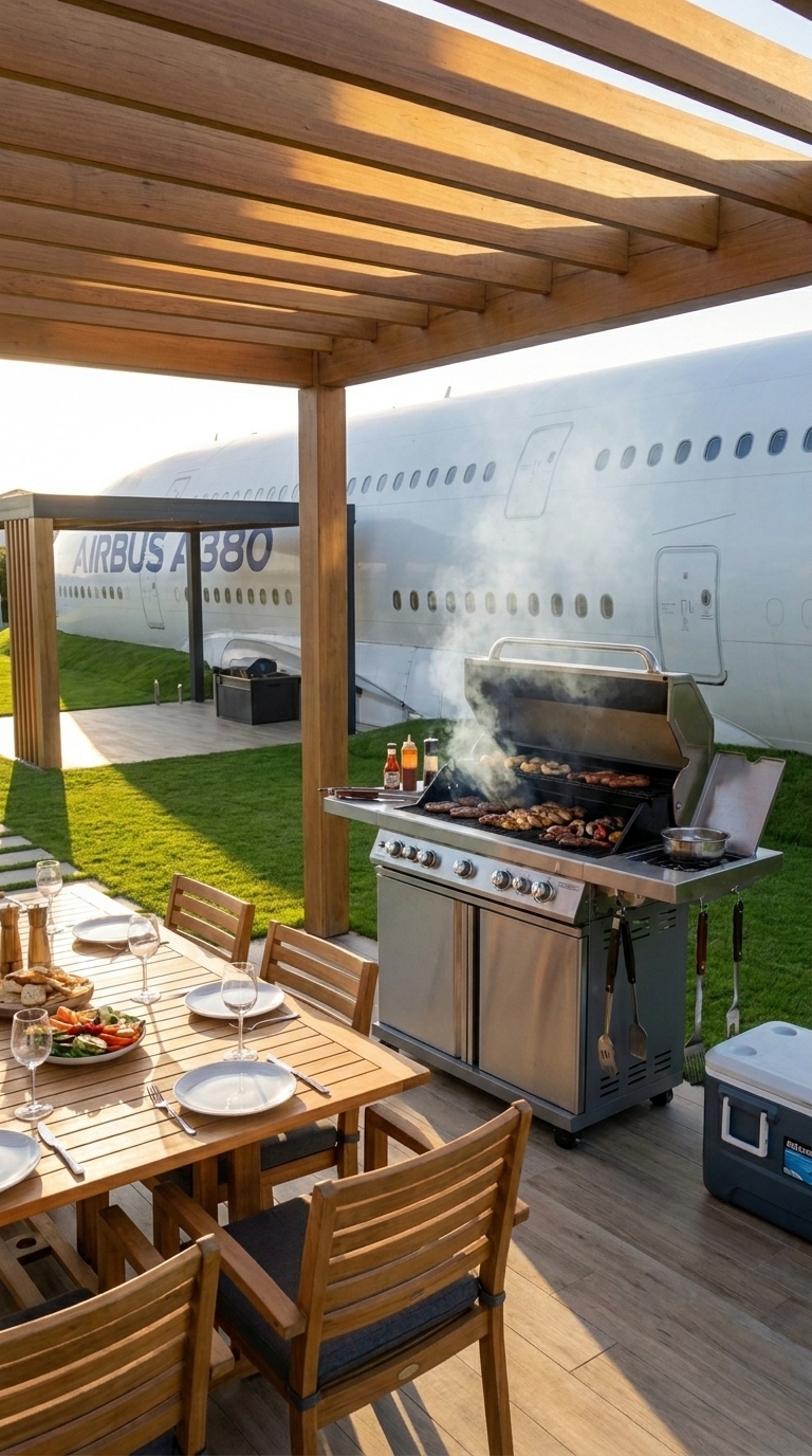 The barbecue area became the social center of the yard. Built under a modern wooden pergola, it combines functionality with a warm and inviting atmosphere. A full-size grill, a large dining table, and carefully planned lighting make it perfect for both everyday meals and gatherings with friends. The placement next to the aircraft creates a unique contrast between industrial design and cozy outdoor living.