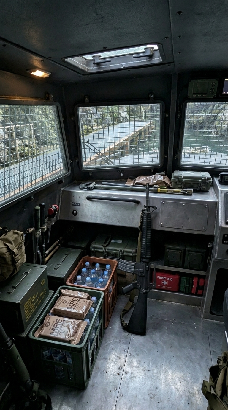 A compact sleeping area, monitoring station, and essential life-support systems ensure that the space can function autonomously if the upper structure becomes compromised.