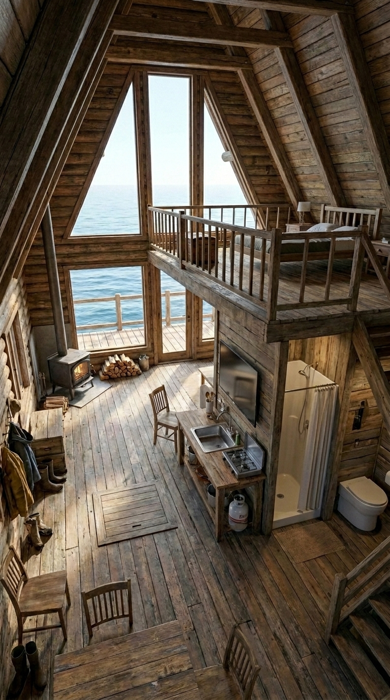 Above, a loft sleeping area overlooks the main floor, offering privacy while maintaining connection to the space below. From this elevated position, the view extends directly toward the ocean, reinforcing the feeling of isolation and control over the environment.