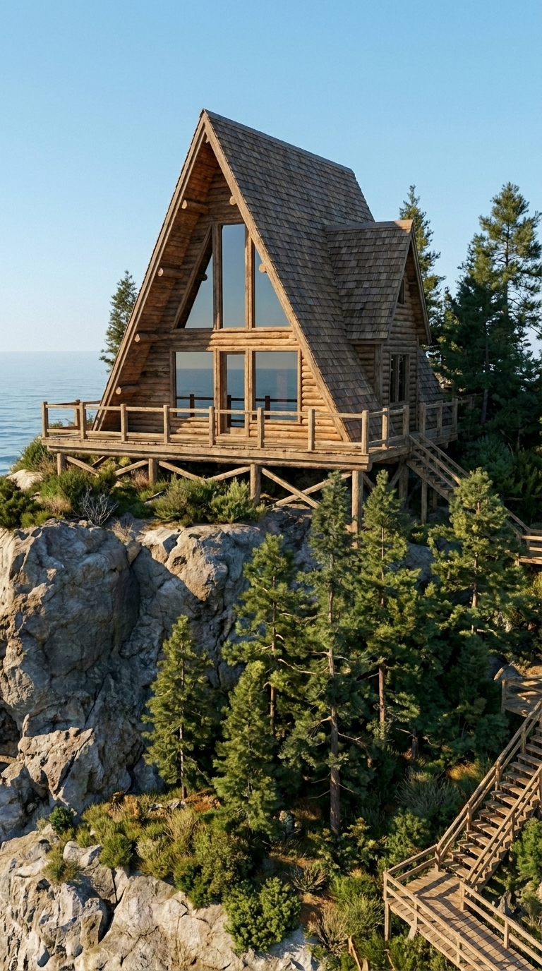 Inside the house, the design focuses on warmth, simplicity, and complete independence, while seamlessly integrating a hidden underground bunker carved directly into the rock beneath the structure. The main living space follows an open A-frame layout, with high wooden ceilings and panoramic windows facing the ocean. Natural light fills the interior during the day, creating a calm and livable atmosphere despite the remote and rugged location.