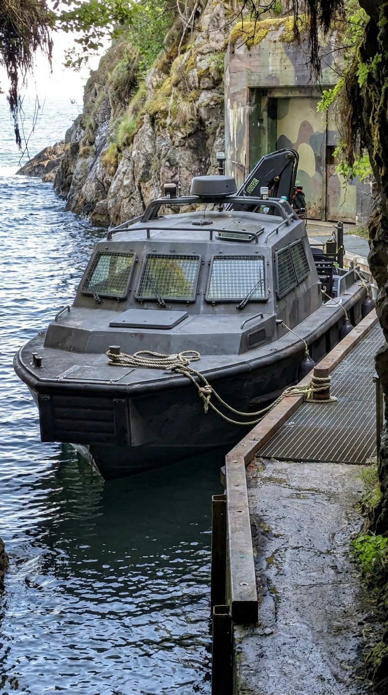 Docked within this protected space is a fully armored evacuation boat. Built for durability and rapid deployment, it features reinforced panels, protected windows, and a compact but powerful engine system capable of navigating rough waters. The design prioritizes reliability and speed, ensuring that evacuation can happen within seconds of arrival.